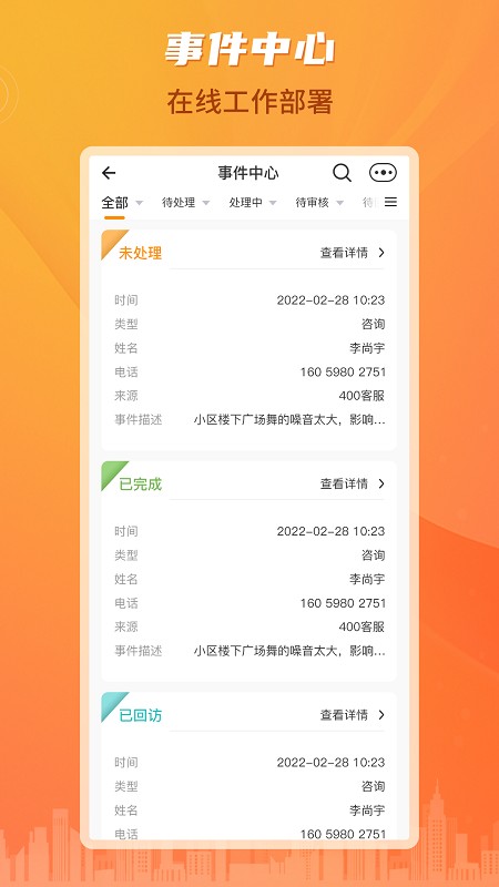 【事件中心】业主端App和400电话拨打的方式进行事件录入,事件类型分为咨询、建议、投诉、报修四类,事件中心状态分为待处理、处理中、已完成、待回访,查询情况需要进行转工单处理、电话回访、信息回复业主,支持事件分类统计
