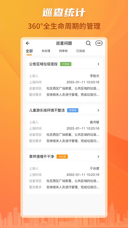 【工单管理】查看业主端报修后的进展状态,工单分为待处理、处理中、已完成、已挂起、待回访,支持工单优先级设置