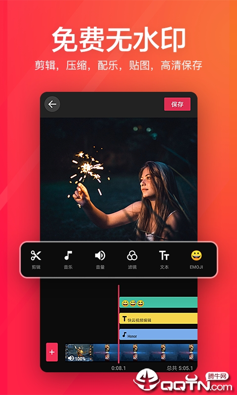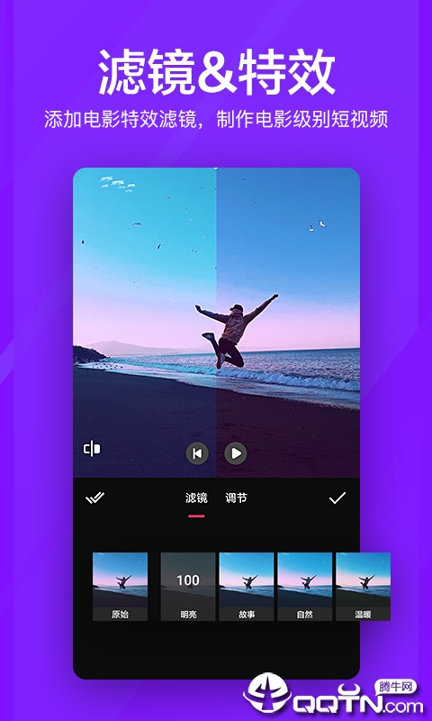 全新快慢放功能,添加视频滤镜和特效的同时,调整视频速度:调快视频速度,让视频更有趣;减慢视频速度,记录特别时刻;调整设置视频亮度,对比度,饱和度等等,自定义制作专属滤镜和特效。内置专业级调色工具,可以精确控制每个色彩参数。