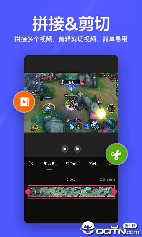 合并,剪切,剪辑,拆分,压缩,快慢放(视频调速从0.5倍到2.0倍),添加音乐,使用FX特效,全尺寸,分享...不损坏视频质量