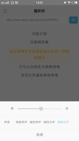随听听app是一款革命性的语音播报软件,专注于为用户提供"听资讯"的便利体验。它不仅能够智能朗读微信文章和各类新闻资讯,还能准确识别网页内容进行语音转换。采用先进的语音合成技术,提供自然流畅的朗读效果,支持多种语音风格选择。无论是工作间隙还是休闲时刻,都能让用户解放双眼,用耳朵接收信息。这款应用特别适合视力不佳或长时间用眼的人群,是提升生活效率的得力助手。