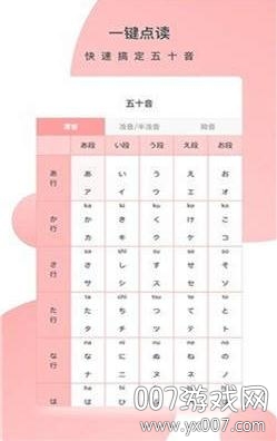 完整的日语五十音图表,包含平假名、片假名,清音、浊音、半浊音、拗音发音及其罗马音,每个发音都配有口型示范动画。清晰真人发音,由专业日语教师录制,帮助你为进一步学习日语打好基础。游戏化学习模式,边学习边玩小游戏,提高学习的趣味性,让学习不再枯燥。金巧指日语帮你联想,通过形象记忆法和场景应用,帮你快速记忆五十音图,快速掌握五十音图。学习数据智能分析,定期生成学习报告,让你清楚了解自己的进步情况。