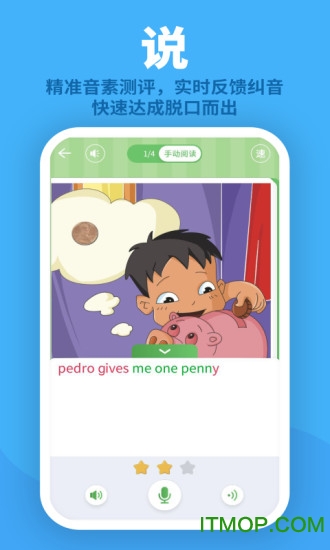 纯正外教口语,逐字范读播放,实时录音跟读,精准到音素的语音测评反馈!系统采用先进的语音识别技术,能准确指出发音问题,并通过趣味练习帮助孩子改善发音,培养地道英语口音。