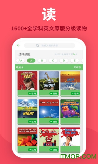 科普、探险、名著、童话、历史、自然科学等海量内容,来自美国顶尖出版社RosenPublishing,配有国际通行的蓝思(Lexile)值,随心选择!平台每周更新书库,确保孩子总能找到感兴趣的新读物,保持学习热情。