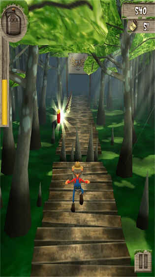 《月光下逃亡》采用精美的3D画面和第三人称视角,为玩家呈现出一个令人惊叹的月光森林世界。游戏场景中,皎洁的月光透过茂密的树叶洒落下来,营造出一种既神秘又梦幻的氛围。游戏讲述了一个有趣的故事:来自阿巴拉契亚山脉的山人因为偷酒被警察发现,现在必须借助玩家的帮助,在这片月光森林中展开逃亡。游戏的操作方式极具创意,向上滑动屏幕可以跳跃障碍,向下滑动可以趴地滑行,左右滑动则能控制转向。此外,晃动手机可以收集散落的酒瓶,点击屏幕还能投掷石头击碎挡路的空酒瓶。这种将体感与触控完美结合的操作方式既简单易学又充满新意,为跑酷游戏带来了全新的玩法体验。