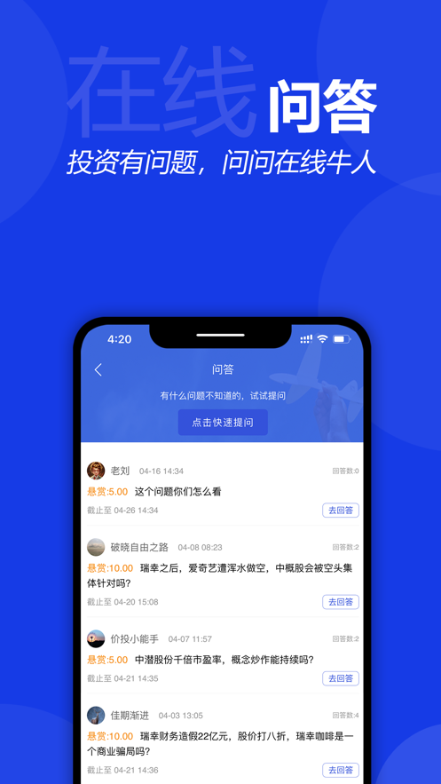 【在线问答】搭建专业投资交流平台,用户可随时向在线牛人请教投资问题,获取实战建议