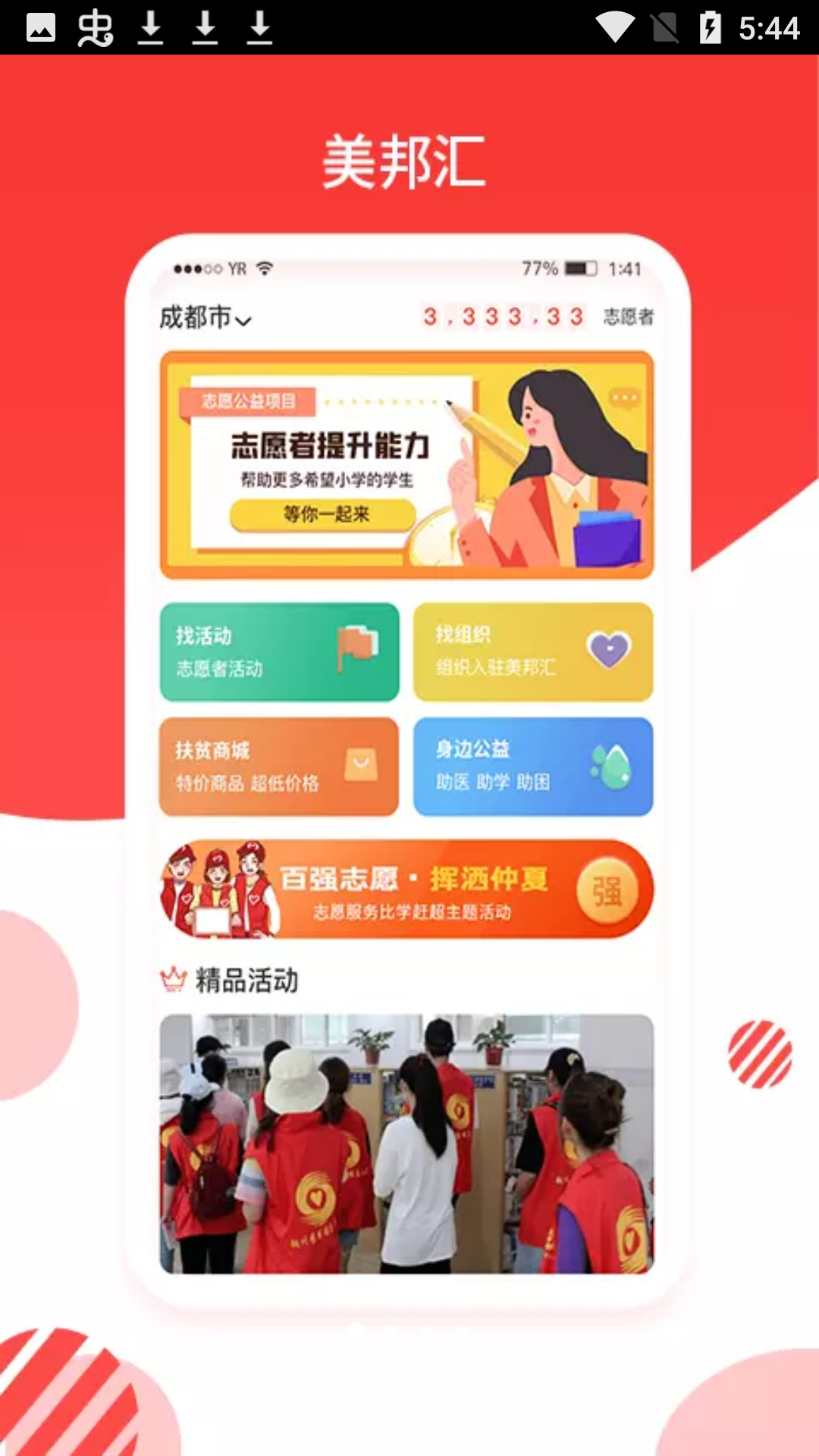 公益活动,扩大交际:平台与多家公益机构合作,提供丰富多样的志愿服务活动,用户可以根据自己的兴趣和时间安排参与,在帮助他人的同时拓展社交圈。