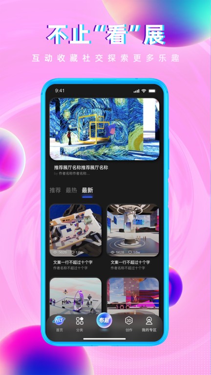 网演,结合虚拟现实、增强现实、大数据、区块链、互联网等前沿技术,建构全球首个艺术元宇宙展览平台。平台不仅提供3D布展、看展等基础功能,还整合了艺术交易、资讯分享、社交互动等多元化服务,打造全方位的艺术生态系统。通过智能算法和个性化推荐,让每位用户都能发现感兴趣的艺术内容,建立专属的艺术社交圈。