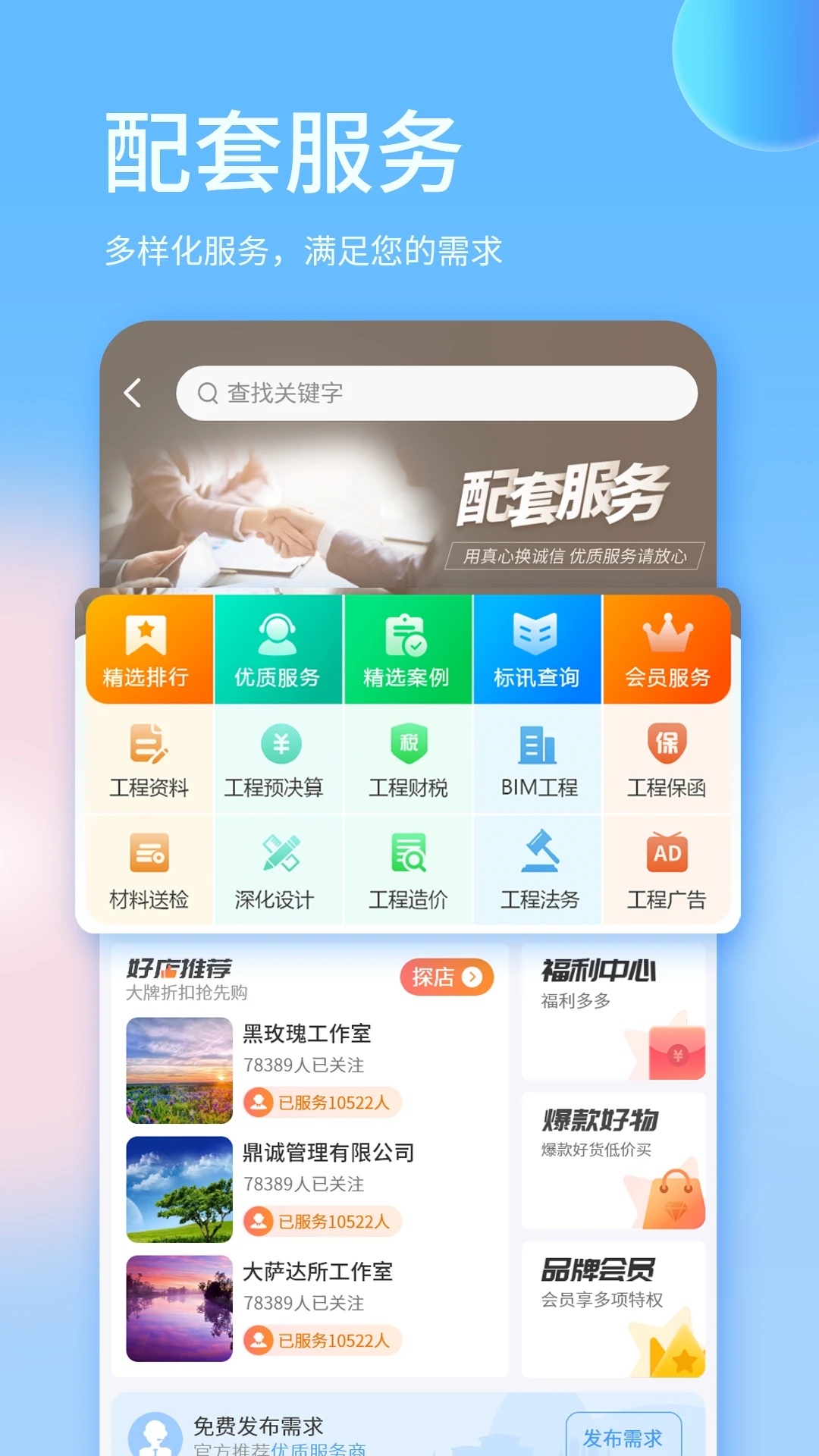 优质的新品好货随时更新,精选优质建材商品让用户第一时间掌握行业最新动态;丰富的工程资料库支持在线下载,方便用户随时查阅和保存重要文件;创新的信息发布系统让用户能够实时上传工程需求和项目信息,全新的展示方式让信息传递更加高效。