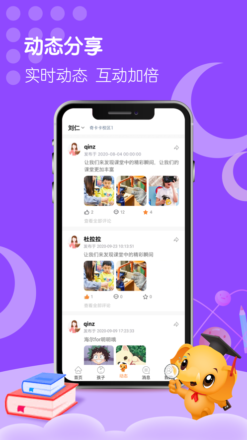 动态分享:平台支持照片、视频等多种形式的动态分享,家长可以随时查看孩子在校园活动的精彩瞬间,还能点赞评论,增进亲子互动。