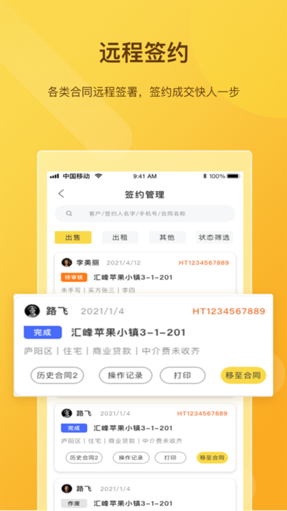 快签约:采用行业领先的远程电子签约技术,通过权威机构认证的身份验证系统,让签约不再受时间和空间限制,真正实现随时随地快速签约。