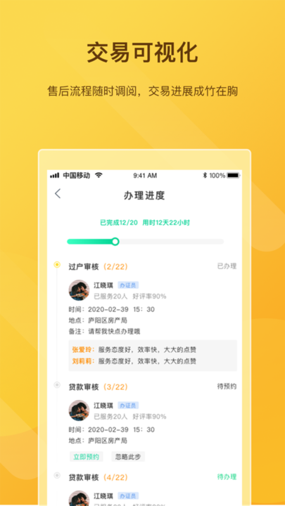 快办理:创新的售后进度追踪系统,让经纪人可以一键查询交易进度,随时发起服务催办,同时收集客户评价反馈,显著提升服务效率和服务质量。
