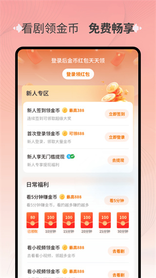 在享受精彩短剧的同时,还能参与边看边领红包的活动,只需通过观就能完成任务领取福利。平台设置了多种互动任务,包括观看时长奖励、分享剧集奖励等,让用户在休闲娱乐中轻松赚取现金。所有奖励都可以直接提现到个人账户,真正做到看剧赚钱两不误。