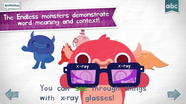 Endless Reader安卓版是一款专为3-8岁儿童设计的趣味阅读启蒙应用,通过生动有趣的互动方式帮助孩子掌握英语常见词汇。应用采用精美的卡通画风,搭配可爱的怪物角色和丰富的动画效果,让孩子在游戏中自然习得"视觉词汇"。免费版本提供6个基础词汇体验,完整版需付费解锁全部内容,家长可先让孩子试玩后再决定是否购买。独特的文字解谜玩法让字母"活"起来,每个单词都配有互动场景和例句,如"dog"会变成汪汪叫的小狗,让学习过程充满惊喜。