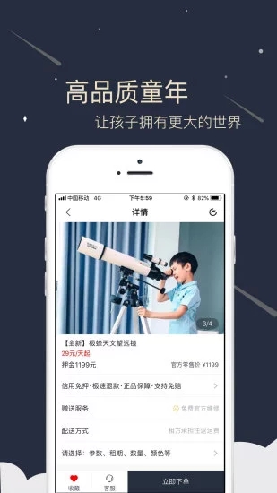 平台提供丰富的儿童高端商品租赁选择:包括珠江、星海、恺撒堡、柯纳比、雅马哈等知名品牌钢琴,满足孩子音乐学习需求;还有小米AI智能音响、体感车、VR眼镜等好玩智能设备,激发孩子创造力;更有时尚童车、高端学习桌椅、益智玩具等各类儿童用品,全方位满足不同年龄段孩子的成长需求。