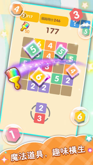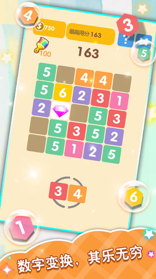 《合合乐》的核心玩法既简单又富有深度。玩家需要将屏幕下方随机出现的数字方块拖动到上方2048风格的网格中。当三个相同数字的方块相邻时,它们就会合并成更高一级的数字。例如,三个数字6的方块合并后会产生宝石,而三个相邻的宝石则可以消除周围3x3区域内的所有方块。