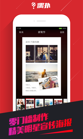 偶扑APP安卓版是一款专为追星族打造的明星互动社区平台。作为追星达人的必备神器,这里汇聚了全球最新鲜的明星动态、独家高清写真和精彩视频资源。平台不仅提供丰富的线上内容,还定期组织各种有趣的线下见面会和粉丝活动,让粉丝们能够近距离接触偶像。无论你是想了解爱豆的最新动态,还是想和其他粉丝一起应援打call,偶扑都能满足你的需求,快来加入这个充满活力的追星大家庭吧!