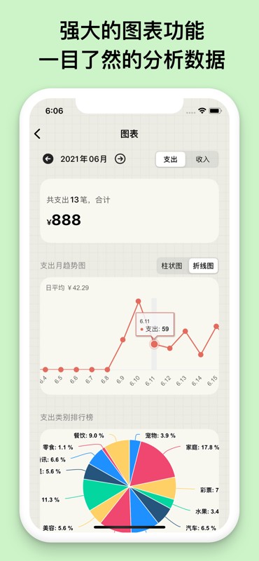 账单图表,新增支出收入便捷统计,优化了图表加载速度和交互体验