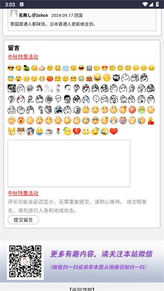 再往下可以在该搬运贴下面留言,留言提交后会显示在上方红框中。平台支持@其他用户功能,并提供了丰富的表情包选择,让互动更具趣味性。