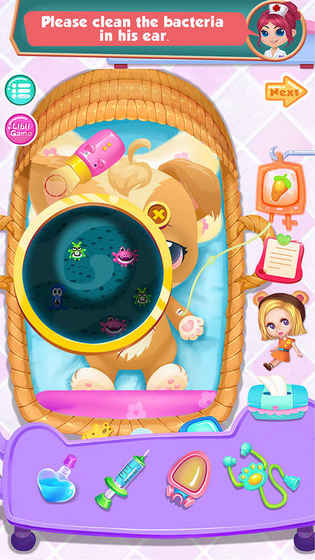打开游戏,选择一个你喜欢的宠物宝贝开始治疗。在屏幕底部,您可以选择不同的医疗器械来治疗它,比如拖动棉签清洁伤口,拖动镊子去除木头碎片,拖动X光机到病人身上,并用创可贴覆盖患者的受伤部位,将冰袋拖至患者前额以降温等等。同时,创可贴,冰袋,输液瓶有多种不同的款式可供选择。游戏还特别设计了多种治疗场景,从简单的包扎到复杂的检查,让玩家体验完整的宠物医疗过程。完成治疗后,别忘了为康复的宠物宝宝拍张照片留念,记录下这温馨的时刻!
