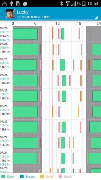 母乳/奶粉/辅食/换尿片/睡眠(可设置夜间睡眠区间)/吸奶量/体温变化,全面记录宝宝各项指标