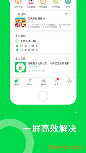 教师与家长通过公告通知、美乐瞬间、宝宝课表、宝宝食谱、宝宝出勤、宝宝主页、宝宝健康、通讯录等功能实现安全、高效的家园互动,其中美乐瞬间支持照片自动归类和时间轴展示,让成长记录更有条理。