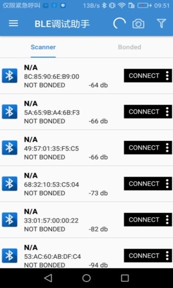 设备扫描:能够全面扫描附近的蓝牙设备,详细显示每个设备的MAC地址、信号强度(RSSI)等关键信息,帮助开发者快速识别目标设备。