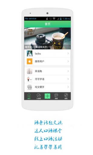 支持、、图片、表情英语交流,同时设有达人课堂,你的英语好,那你就帮助一下小伙伴们吧,这样你也可以获得很多小粉丝哟!多元化的交流方式让表达更生动,而达人课堂则为英语高手提供了展示和分享的平台,形成互帮互助的学习社区。