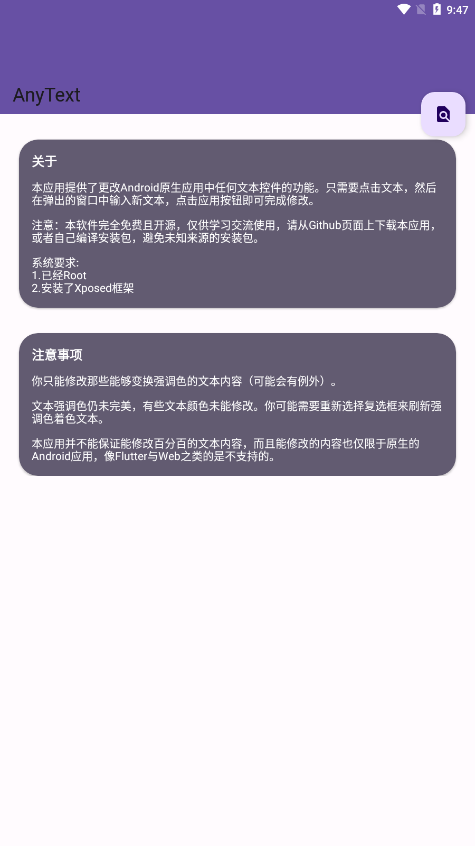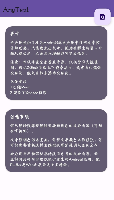 -本应用并不能保证能修改百分百的文本内容,而且能修改的内容也仅限于原生的Android应用,像Flutter与Web之类的是不支持的。对于特殊框架开发的应用,建议查看官方兼容性说明或等待后续版本更新。