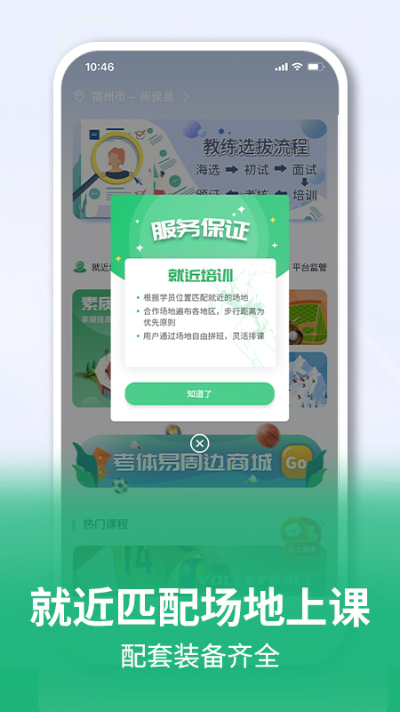 就近匹配上课更加方便,在将自己的定位打开后就可以直接的匹配到自己周围的一些课程,系统会智能推荐距离最近的优质场馆和私教资源;