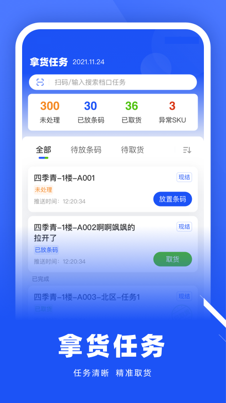 拿货任务:智能分配任务清单,支持按品类、仓位等多维度筛选,取货准确率高达99.9%;