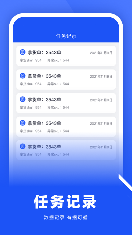 任务记录:完整记录操作轨迹,支持按日期、操作员等条件查询,数据自动生成可视化报表;