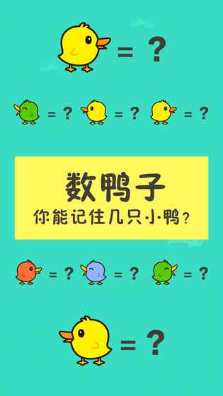 你要尽可能的记住你看到的小鸭子的种类和数量,你要区分它们是向左走的还是向右走的,是什么颜色的;游戏特别注重细节观察,每只鸭子的移动方向和颜色都可能成为答题关键。小鸭子走完后,会随机提问你其中的某种小鸭有几只,例如"向左走的小黄鸭=?"(你不仅要注意问题中小鸭子的颜色而且要留意它的方向!);这些问题会随着游戏进程变得越来越复杂,考验玩家的综合记忆能力。在限定时间内回答问题,回答得越快速,获得的奖励分数越高!但一定要保证答案正确哦;系统会根据答题速度和准确度给出星级评价,激励玩家不断突破自我。每局中第一次回答错误都有一次复活的机会,你只有五秒的时间选择是否要复活。你也可以重新开始新的一局。