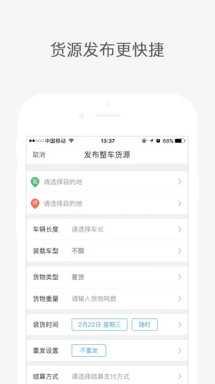 智能货源匹配:通过大数据分析,一键发布货源信息,系统自动匹配最适合的物流车源,大幅提升配货效率。