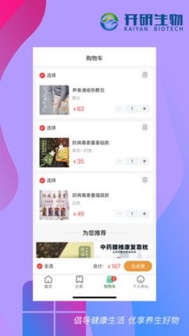 开研健康的导航栏设计清晰明了,分为“首页”、“健康咨询”、“我的订单”、“个人中心”等多个板块,方便用户快速找到所需功能。首页展示了各类产品分类、热门药物推荐、新品发布以及限时特价等区域,用户可以轻松浏览并选购所需商品。通过购物车功能,用户可以快速完成结算,享受高效便捷的购物体验。
