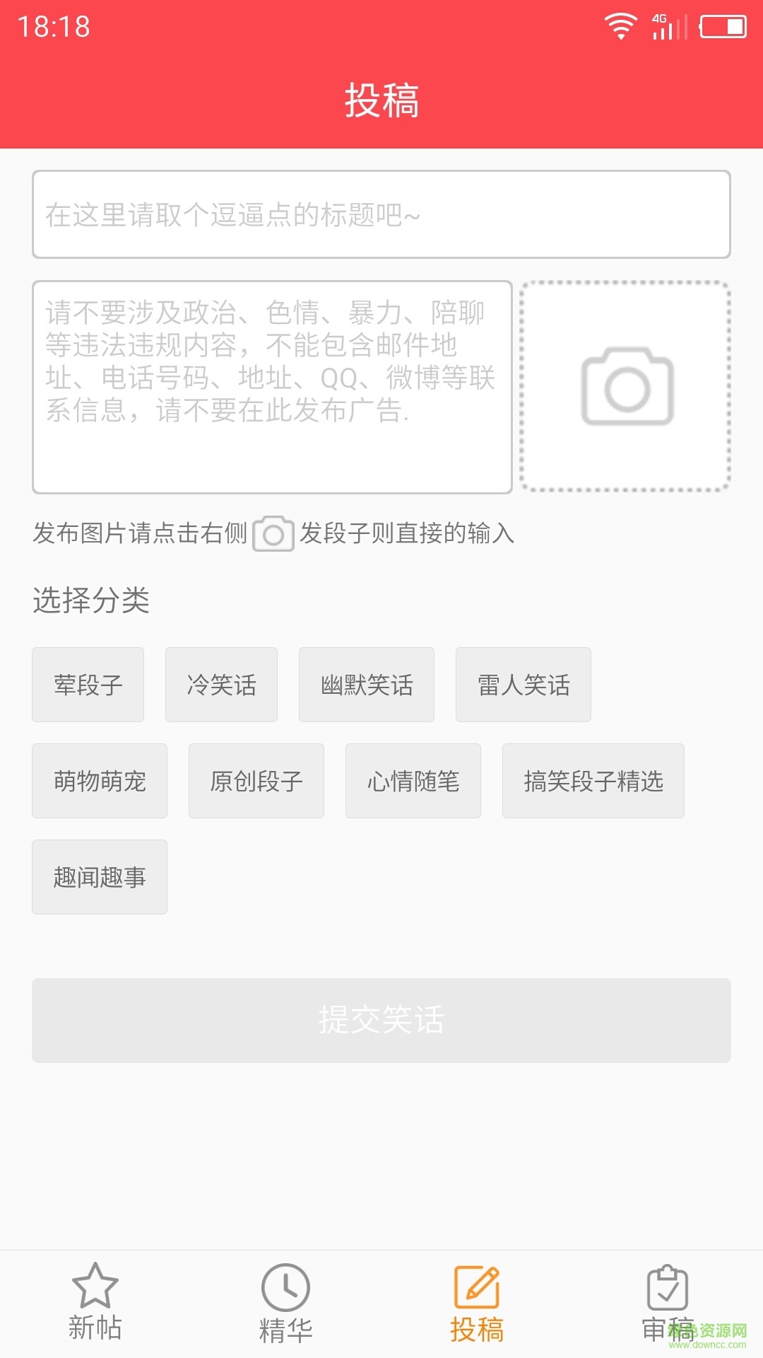 喷饭笑话拥有丰富的特色功能,独创的投稿系统让用户也能成为内容创作者,优秀投稿者将获得精美礼品和专属认证。应用界面采用最新扁平化设计语言,色彩明快布局合理,即使是初次使用也能快速上手。强大的社交分享功能支持一键转发到微信、QQ等主流平台,让欢乐加倍传递。内容板块精心划分为囧图、段子、GIF、视频等类别,收录超过10万条精品内容,专业编辑团队24小时不间断更新,保证你每次打开都有新发现。