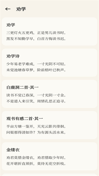 设有智能分类功能,支持按主题快速查找内容,包括劝学、古诗歌、诗经等三大类别。用户只需通过分类区即可快速定位所需内容,大大提升了阅读效率。无论是想学习励志名篇,还是欣赏优美诗词,都能一键直达。