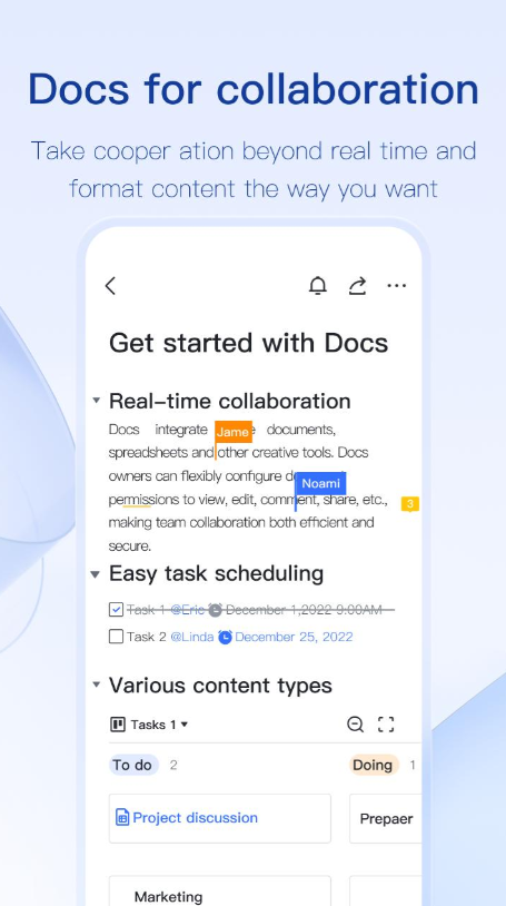-通过文档创建和共享内容,您可以在其中与团队成员实时协作处理文档和电子表格,支持版本历史追溯和精细权限管理