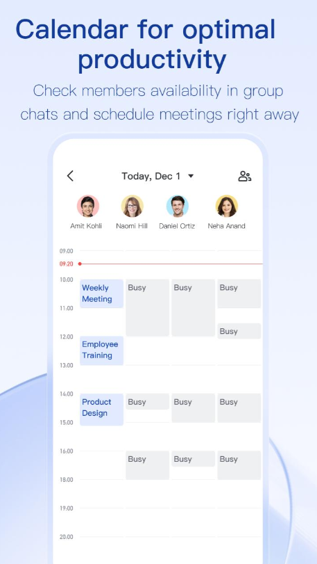 -使用我们的日历随时掌握您的日程安排。通过任何会议邀请,您可以创建群聊、发起视频通话或创建会议,智能提醒功能确保不错过重要日程