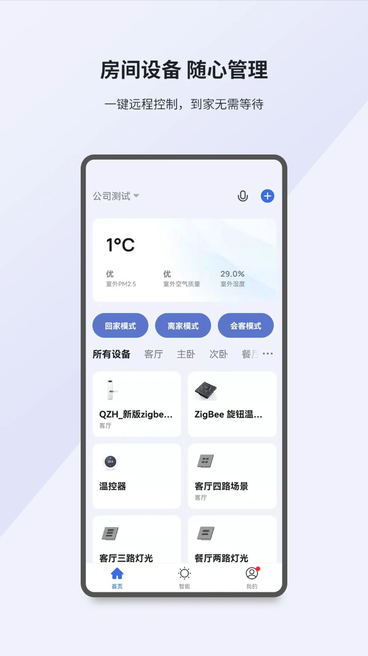 2.周末回老家,把所有房间灯光设为离家模式,一键关断超省心,不怕忘关。离家后系统会自动启动安防模式,门窗异常开启会立即推送报警。