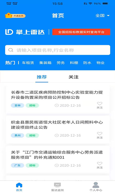 掌上雷达APP是一款专为小微企业打造的权威信息查询平台,致力于为用户提供及时、全面的招投标项目信息。通过该平台,企业能够快速获取全国各地的招标公告、中标信息及项目变更动态,精准把握商业机遇。无论是招标定制、竞争对手监测,还是标书代写等增值服务,掌上雷达都能一站式满足用户需求。其强大的数据整合能力和智能化推送功能,让用户随时随地掌握行业动态,抢占市场先机,助力企业高效发展。