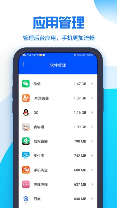 【应用管理】提供专业的应用分析功能,可查找并删除无用的应用程序,为您的手机释放宝贵存储空间。支持批量卸载操作,并能显示每个应用的具体占用情况,让清理更精准。