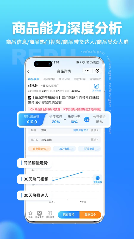 热度星推为用户提供超过50万+的抖音、快手等平台热销商品,覆盖了几乎所有常见商品类目,商品详情资料完整详尽。平台致力于帮助用户轻松高效地发现爆款商品,海量优质好物等待您的选购和分享。此外,还提供专业的商品数据分析、高效转链工具、实时排行榜等实用功能,全方位满足用户的购物需求,让购物体验更加智能便捷。