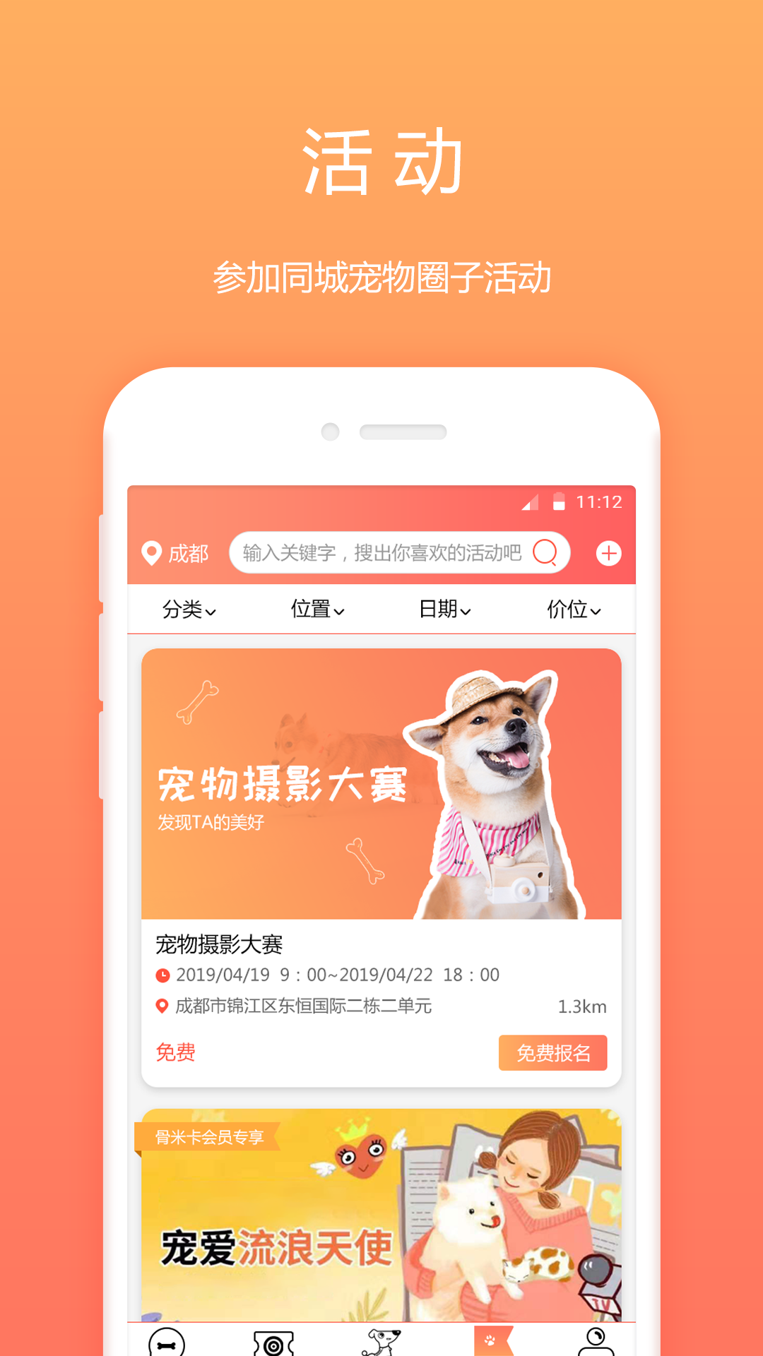骨米活动平台汇集了各类同城宠物活动信息,包括宠物聚会、户外郊游、专业赛事、培训课程以及公益活动等。无论是想结交宠友,还是参与专业活动,这里都能满足您的需求,让您和爱宠的生活更加丰富多彩。