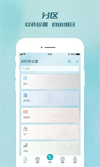 点击nXP办公室模块,用户可以直观查看园区内的不同建筑分布,例如教学楼A栋、B栋等。通过地图式界面,轻松选择目标办公楼或教学楼,实现精准管理。