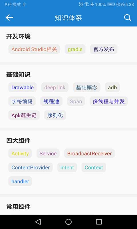 知识体系部分尤为完善,按照开发流程划分为开发环境搭建、基础知识讲解、四大组件解析、常见控件使用、用户交互设计等多个类别。每个类别下都包含详细的教程和示例代码,帮助开发者循序渐进地掌握安卓开发技能。同时,知识内容会定期更新,确保与最新的安卓开发技术保持同步。