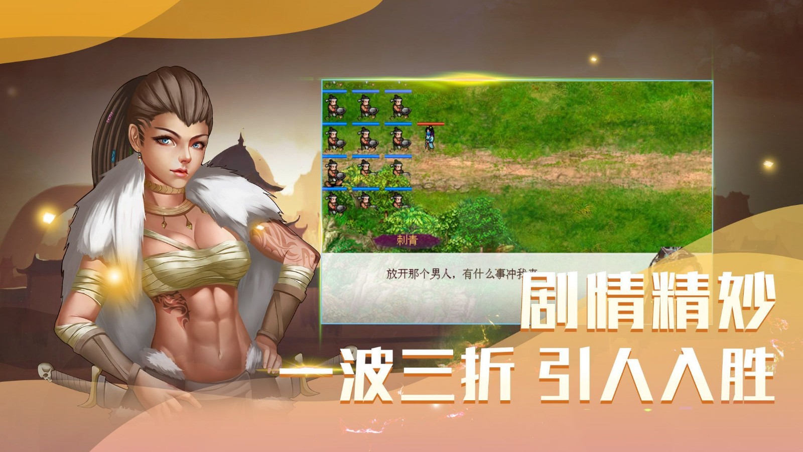 全新的故事演绎不同的人生,原创的情节引人入目,每个NPC都有独立的故事线和隐藏任务等待玩家发掘;充满热情的战旗对战过程,独占鳌头,统一霸业,玩家需要运用地形、兵种相克等策略要素才能取得胜利;复古的游戏画面,搭配不同的策略进行对战,游戏还特别设计了昼夜交替和天气变化系统,让战场环境更加真实多变。