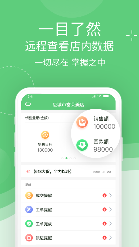 数据可视化呈现 通过直观的数据看板,管理者可以随时随地远程查看门店各项经营数据,所有关键指标一目了然,让决策更加精准高效。