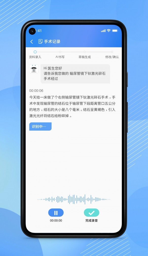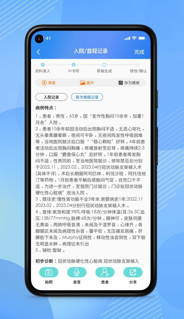 生成病历草稿功能:基于识别结果,AI医助可以智能生成结构清晰、内容完整的病历草稿。医生只需对草稿进行简单修改和确认,就能快速完成病历书写工作,大大节省了文书工作时间。