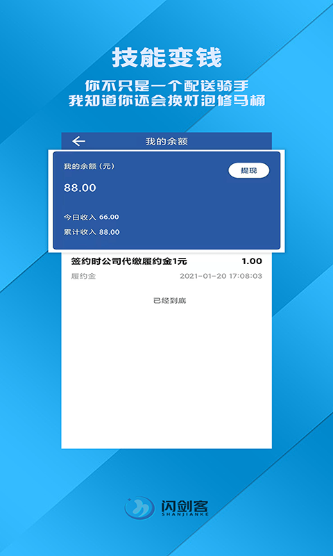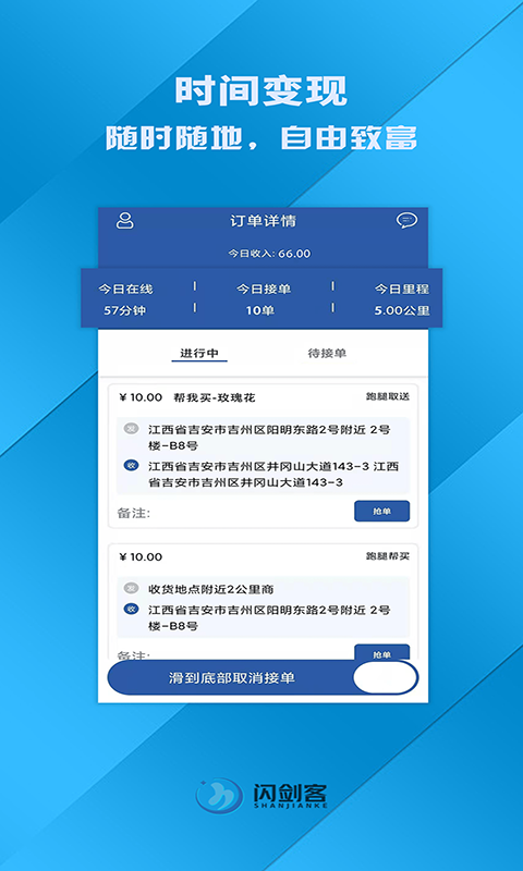 闪剑客服务端app是一款专为自由职业者和兼职工作者设计的同城服务赚钱工具,让您轻松实现时间变现和技能变现。无论您是配送骑手、维修技工还是全能跑腿达人,这款应用都能为您提供丰富的赚钱机会。通过闪剑客服务端,您可以自由接单,灵活安排工作时间,真正实现随时随地自由致富的梦想。